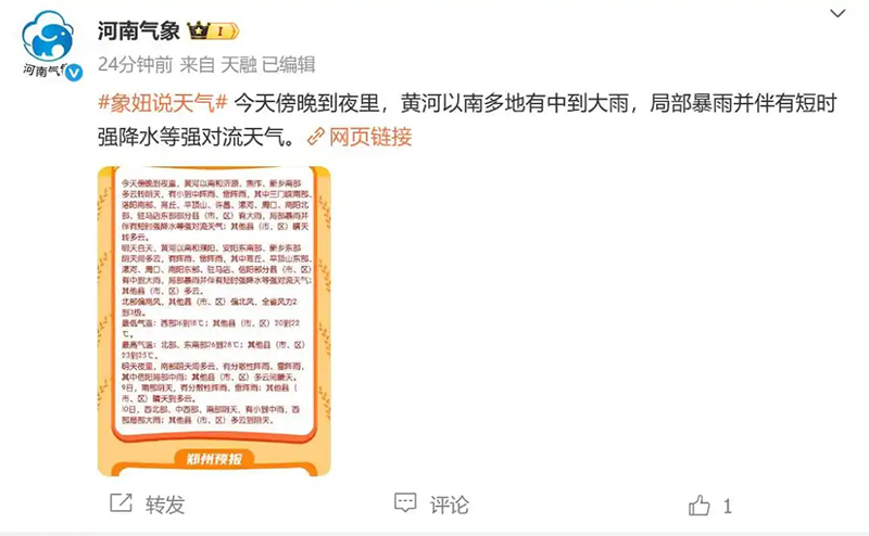 今天傍晚到夜里,黄河以南多地有中到大雨,局部暴雨并伴有短时强降水等强对流天气。