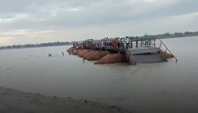 今日印度网站6月28日报道,近日,印度比哈尔邦一座桥梁在大风中发生坍塌,导致大批正在过桥的行人被困河中,动弹不得。