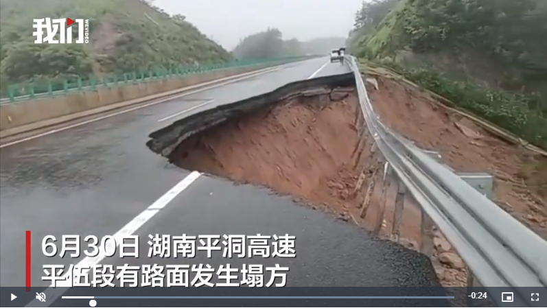 6月30日,有网友发布视频称,平益高速平江县龙门镇路段一处路面出现塌方,建议车辆避开该路段。视频显示,一条高速公路的一段路面发生了塌方,下方的路基和护坡都已被掏空。塌方处两端都停着车辆,高速公路维护人员已经在现场处置。