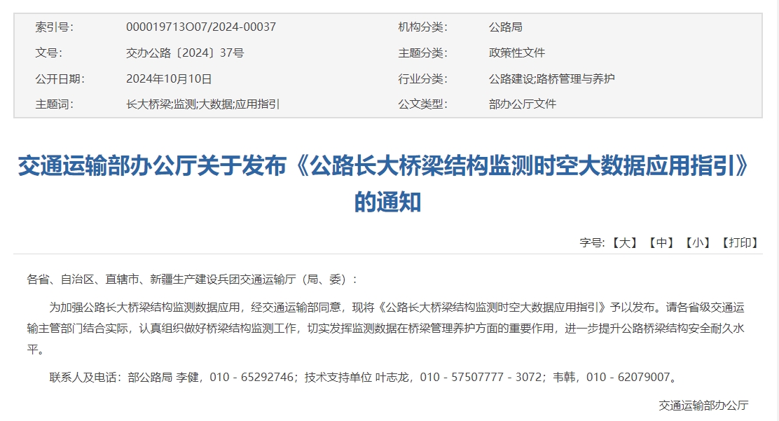 交通运输部办公厅发布通知,为加强公路长大桥梁结构监测数据应用,经交通运输部同意,现将《公路长大桥梁结构监测时空大数据应用指引》予以发布。请各省级交通运输主管部门结合实际,认真组织做好桥梁结构监测工作,切实发挥监测数据在桥梁管理养护方面的重要作用,进一步提升公路桥梁结构安全耐久水平。